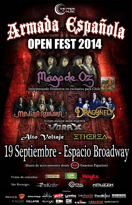 El cartel será liderado por los controvertidos Mägo de Oz, quienes vienen presentando, de manera íntegra, el disco “Finisterra“, serán acompañados por los clásicos Medina Azahara y por los argentino-valencianos DragonFly quienes interpretarán clásicos como “Ángeles de una sola ala” y lo mejor de su último disco titulado “Atlas“.